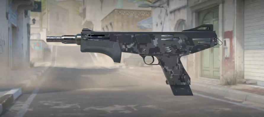 皮肤以冷色调金属质感为核心,枪身接收器与握把区域覆盖着深浅不一的灰色像素迷彩图案,而护手、弹匣及枪身部分区域则保持未涂装的原始质感,形成 “迷彩点缀 + 金属基底” 的简约设计。这种设计既贴合 MAG-7 作为近距离战术武器的定位,又通过金属光泽在光影下呈现细腻质感,被玩家评价为 “原版武器的质感升级款”。